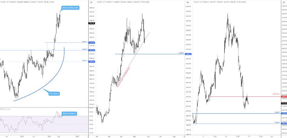 Price action on the weekly timeframe concluded the week in the shape of a bearish engulfing formation, a two-candle signal aided by the Relative Strength Index (RSI) displaying negative divergence out of overbought territory. The weekly bearish signal is equally supported by price action on the daily chart. Following a spirited one-sided decline on Wednesday and Thursday, a move that pulled price through an ascending support-turned-resistance line, extended from the low of $2,147, this may, given Friday retested the underside of the line, open the door to further downside towards familiar support marked at $2,280.