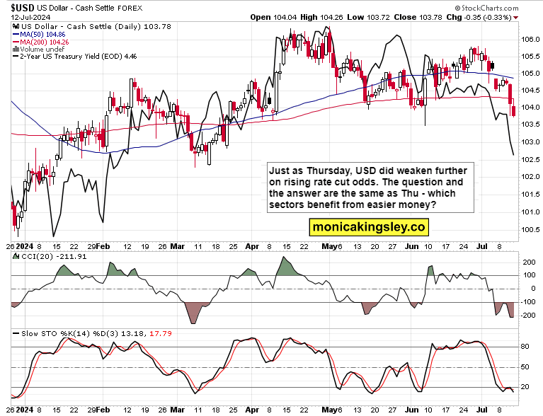 Let‘s drop a few more clues – Thursday, USD, bonds and S&P 500 all simultaneously declined, which is very rare. Did Friday bring about different dynamics, and what did corporate bonds do?