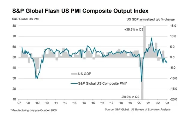 - “The US economy has started 2023 on a disappointingly soft note, with business activity contracting sharply again in January. Although moderating compared to December, the rate of decline is among the steepest seen since the global financial crisis, reflecting falling activity across both manufacturing and services.”