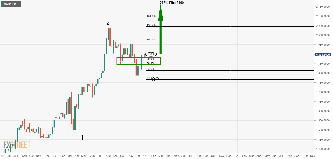 As illustrated, the correction of the monthly bullish impulse from down in the 1450 regions has completed to a 50% mean reversion level.
