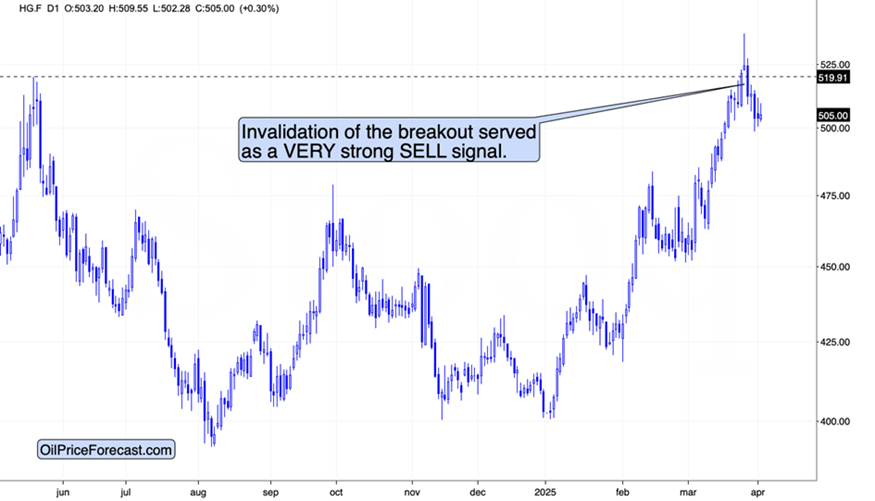 You see, markets often move on the rumor and reverse based on the fact. Gold and copper seem to have rallied based on the rumor that the tariffs are going to be increased today (which Trump called the “Liberation Day”). The above rule suggests that those moves can now reverse, and this would perfectly align with long-term technical charts for both: gold and copper.
