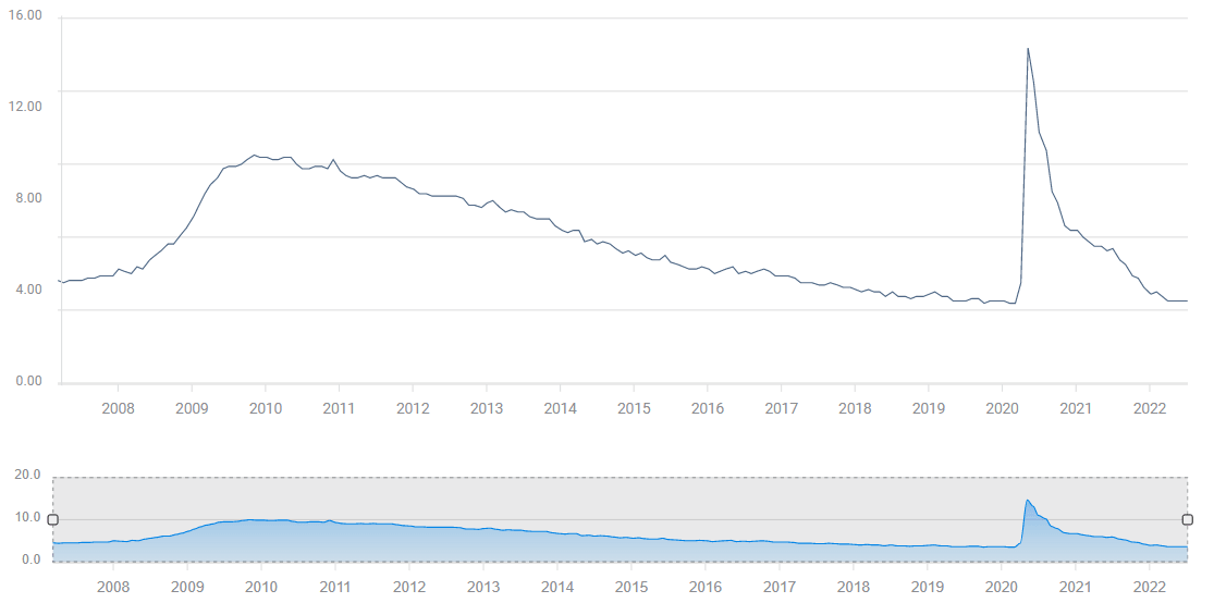 One reason job creation and the unemployment rate have stayed strong despite weak or non-existent economic growth comes from the household survey which calculates the unemployment rate. The labor force dropped by 353,000 workers and the participation rate fell to 62.2% in June from 62.3%. The combination of fewer people looking for jobs and a smaller percentage of available workers employed means a continuing labor shortage resulting in supply and product issues and continued upward pressure on wages as employers compete for scarce help.