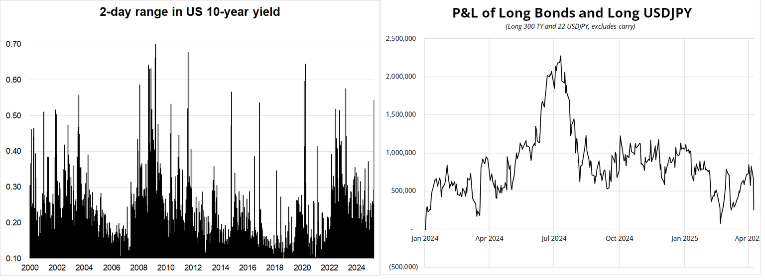 Here are the moves since election day and Liberation Day. Stocks obviously the big victims of the improvisational policy mix while EURCNH has gone to the moon. If this was an attempt to drive bond yields lower, it did not work. The calculation is (move divided by average day range). So SPX is down 22% and average day range is 0.9% = -23.2.