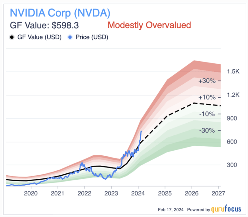 Comparing Nvidia against peers such as AMD, Taiwan Semiconductor, and Broadcom offers valuable insights. AMD boasts a forward price-earnings ratio of 52, Taiwan Semiconductor stands at 18, and Broadcom at 27. Relatively, Nvidia's valuation does not seem exorbitant when juxtaposed with its counterparts. However, a discernible moderate overvaluation persists, as highlighted by the GF Value Line.