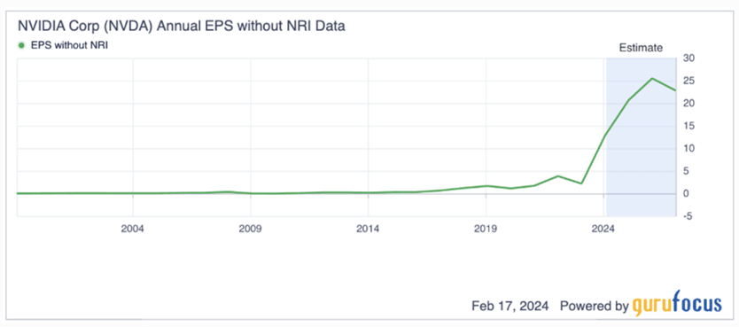 In the preceding year, Nvidia achieved an unprecedented growth in its earnings per share, excluding non-recurring items, at a staggering rate This figure stands in stark contrast to its 10-year average of 34.30%, underscoring a remarkable acceleration in earnings growth.