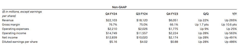 For fiscal 2024, NVIDIA reported record-breaking revenue of $60.9 billion, showcasing an extraordinary 126% growth trajectory. GAAP earnings per diluted share for the fiscal year amounted to $11.93, representing a remarkable 586% surge from the previous year. Additionally, non-GAAP earnings per diluted share reached $12.96, marking an impressive 288% increase from the previous year.
