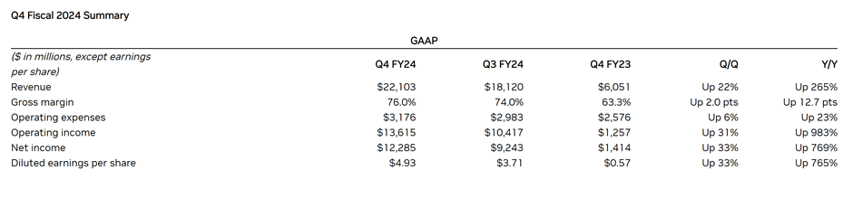 In the fourth quarter ended January 28, 2024, NVIDIA reported record quarterly revenue of $22.1 billion, marking a remarkable 22% increase from the previous quarter and an astonishing 265% surge from the corresponding period a year ago. The company also witnessed a historic quarter in Data Center revenue, reaching $18.4 billion, up by an impressive 27% from the third quarter and a staggering 409% from the same period last year.
