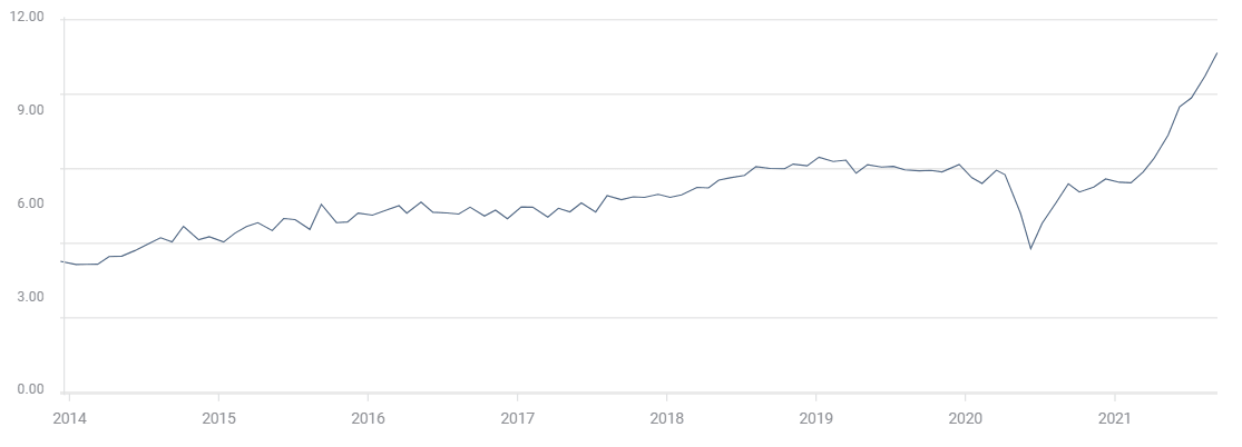 Initial Jobless Claims present another contrast. Despite the huge number of unfilled positions, the weak hiring in August and the expected mediocre NFP for September, Initial Jobless Claims have increased for three straight weeks. Requests for jobless benefits have gone from 312,000 in the week of September 3, a pandemic low, to 362,000.