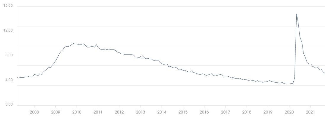 One explanation for the apparent reluctance of workers to return to their jobs has been the extended federal unemployment benefits granted by the Biden administration. Those supplemental payments expired in the first part of September, so a large return to work might be expected. Yet the consensus NFP estimate is just 450,00, hardly a wave.