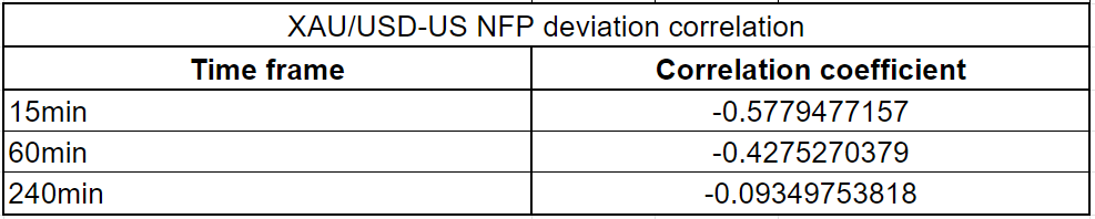Finally, we calculated the correlation coefficient (r) to figure out at which time frame gold had the strongest correlation with an NFP surprise. When r approaches -1, it suggests there is a significant negative correlation, while a significant positive correlation is identified when r moves toward 1. Since gold is defined as XAU/USD, an upbeat NFP reading should cause it to edge lower and point to a negative correlation.