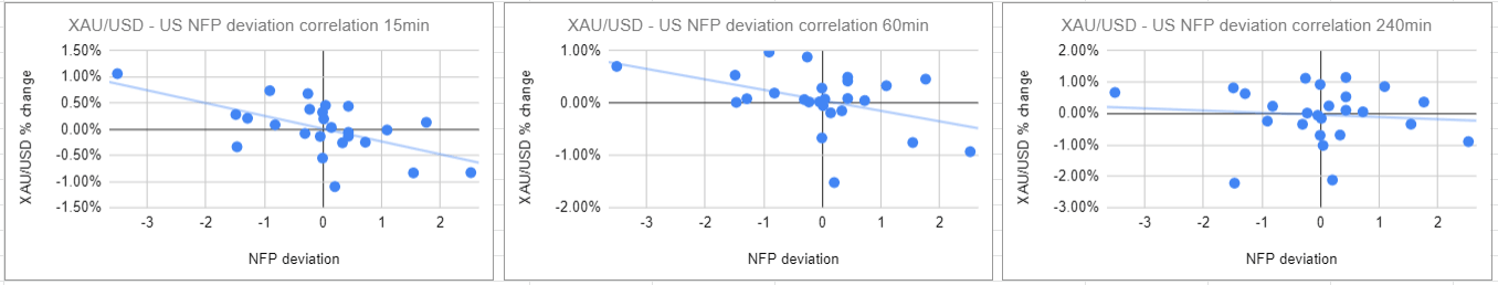 We plotted gold price’s reaction to the NFP release at 15 minutes, one hour and four hours intervals after the release. Then, we compared the gold price reaction to the deviation between the actual NFP release result and the expected result.