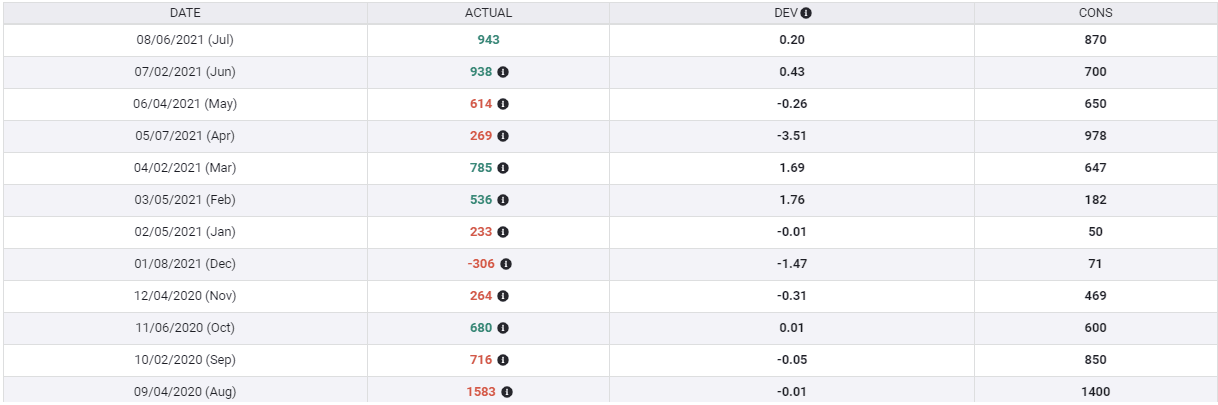 The FXStreet Economic Calendar assigns a deviation point to each macroeconomic data release to show how big the divergence was between the actual print and the market consensus. The -3.51 deviation seen in April's NFP reading could be assessed as a relatively big negative surprise. On the other hand, February’s NFP print of 536,000 against the market expectation of 182,000 was a positive surprise with the deviation posting 1.76 for that particular release.