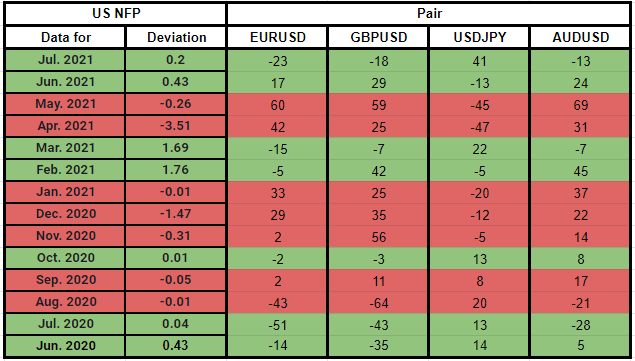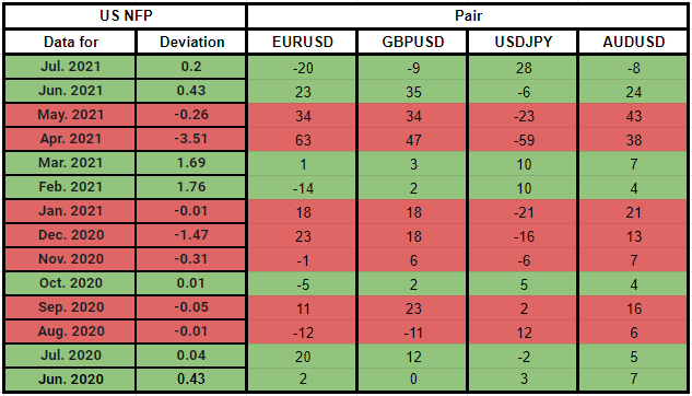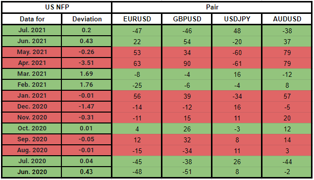 - There is a strong correlation between surprising NFP prints and major pairs' immediate movements.