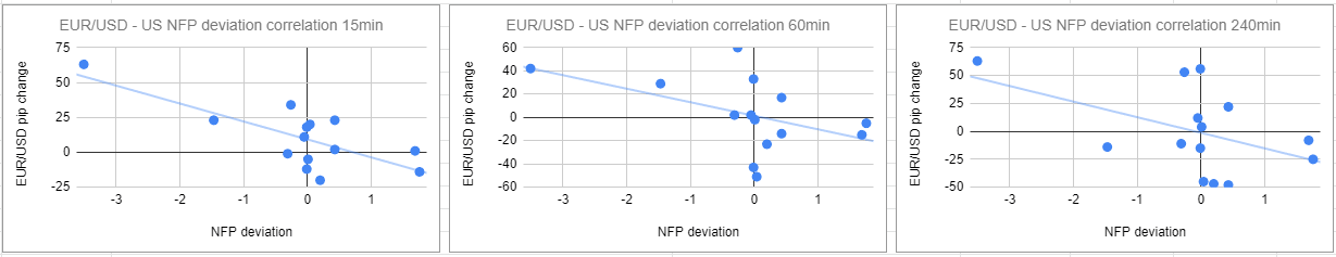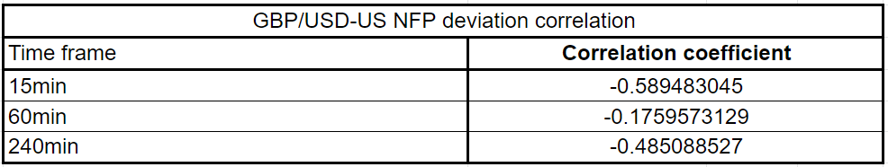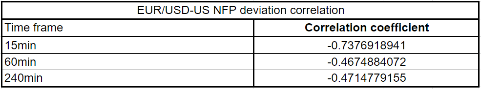 EUR/USD has a correlation coefficient of -0.77, -0.46 and -0.47 15 minutes, 60 minutes and 240 minutes after the release, respectively. These numbers suggest that the impact of the NFP deviation on EUR/USD fades away following a strong reaction initially.
