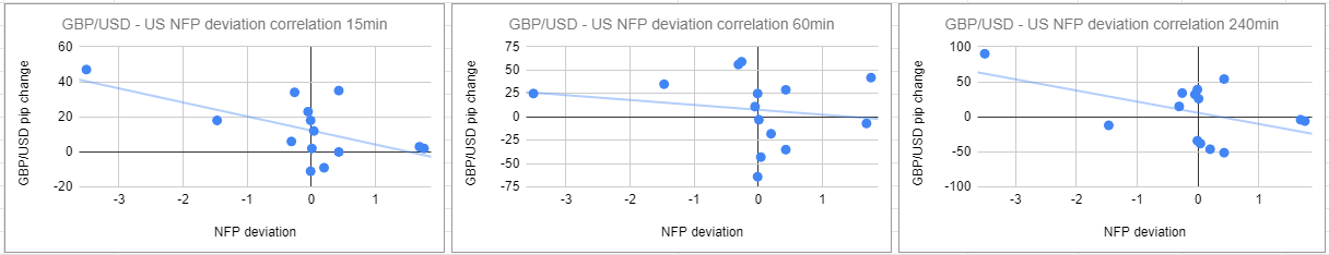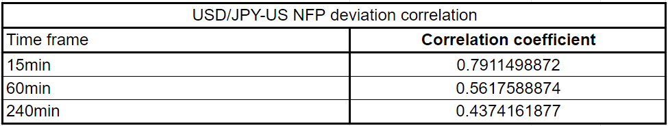 USD/JPY has a correlation coefficient of 0.79, 0.56 and 0.43 15 minutes, 60 minutes and 240 minutes after the release, respectively. These numbers suggest that the NFP deviation has a strong positive correlation with the pip-change in USD/JPY 15 minutes and one hour after the release.