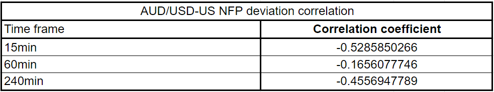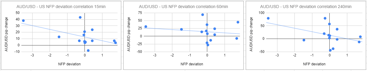 AUD/USD has a correlation coefficient of -0.52, -0.16 and -0.45 15 minutes, 60 minutes and 240 minutes after the release, respectively. These numbers suggest that the inverse correlation with the pip-change in AUD/USD and the NFP deviation 15 minutes after the release is weaker than it is for EUR/USD and GBP/USD. Similar to GBP/USD, AUD/USD shows no interest in the NFP print one hour after the release.