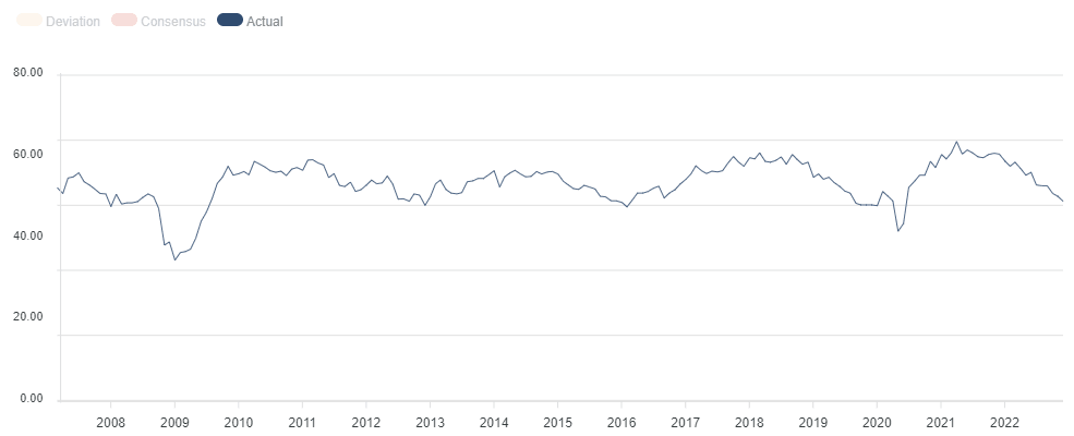 The US manufacturing sector contraction is set to deepen further in the final month of 2022, having shrunk for the first time in November after May 2020 when the economy began to recover from the Covid lockdown-induced downturn. The US data will be published on Wednesday at 15:00 GMT.
