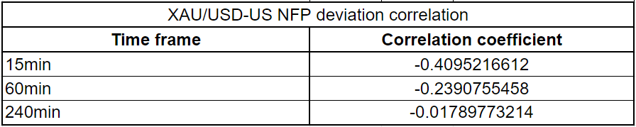 Finally, we calculated the correlation coefficient (r) to figure out at which time frame gold had the strongest correlation with an NFP surprise. When r approaches -1, it suggests there is a significant negative correlation, while a significant positive correlation is identified when r moves toward 1. Since gold is defined as XAU/USD, an upbeat NFP reading should cause it to edge lower and point to a negative correlation.