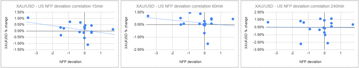 We plotted gold price’s reaction to the NFP release at 15 minutes, one hour and four hours intervals after the release. Then we compared the gold price reaction to the deviation between the actual NFP release result and the expected result.