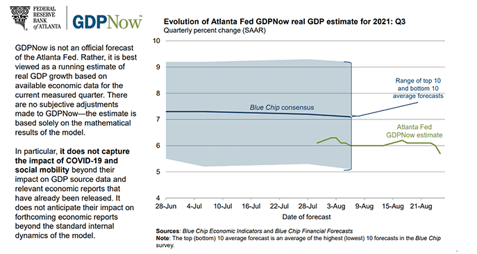 Gross Domestic Product (GDP) expanded 6.3% on an annualized basis in the first quarter and 6.5% in the second, making the first half of the year the strongest in a generation. The latest forecast from the Atlanta Fed GDPNow model is 5.7% for the third quarter.