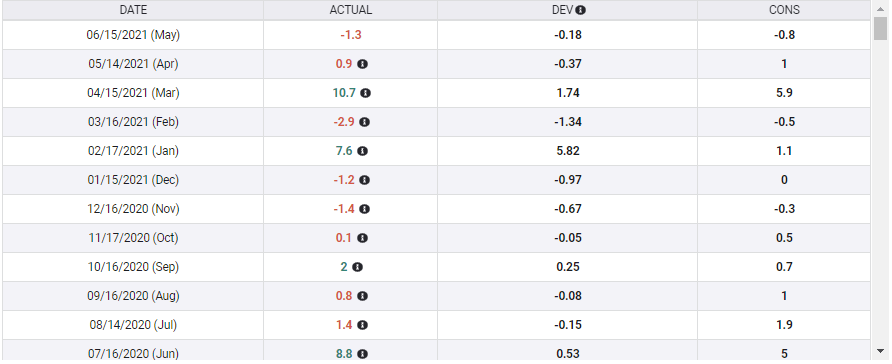 Retail Sales are negative for April and May, the first two months of the second quarter, according to the categories tracked by the US Census Bureau. The latest GDPNow reading (June 16) from the Atlanta Fed has annualized growth at 10.3%. Consumer spending accounts for about 70% of US economic activity and it is hard to reconcile anemic or falling consumption with robust growth.