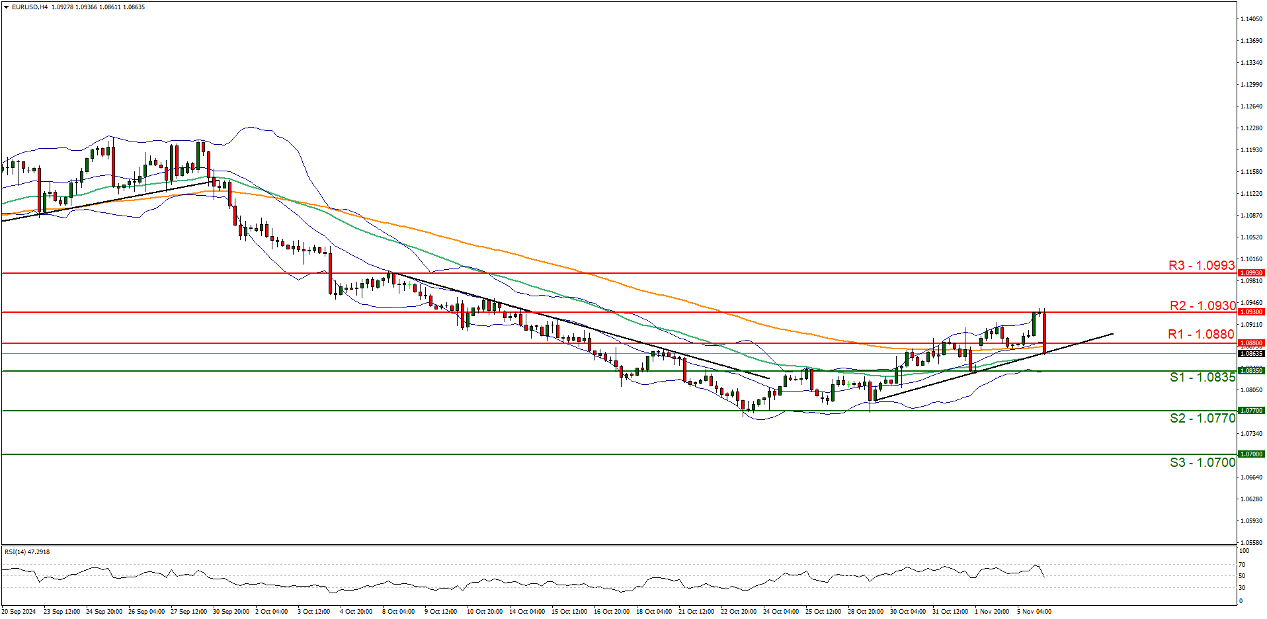 EUR/USD was on the rise today, earlier on during the day, yet with the votes being counted in the US election, it appears that the pair is reversing direction. In particular the pair has just broken below our support turned to resistance level at the 1.0880 (R1) line. We opt for a bearish outlook for the pair and supporting our case is the RSI indicator below our chart which has sharply dropped below the figure of 50, implying a bearish market sentiment may be emerging. Moreover, we would like to note that an upwards gap was formed just above our S1 support level. For our bearish outlook to continue we would require a clear break below the upwards moving trendline which was incepted on the 29th of October in addition to a clear break below the 1.0835 (S1) support level, if not also the 1.0770 (S2) support line with the next possible target for the bears being the 1.0700 (S3) support base. On the flip side for a bullish outlook we would require a clear break above the 1.0880 (R1) resistance line if not also the 1.0930 (R2) resistance level with the next possible target for the bulls being the 1.0993 (R3) resistance ceiling. On a political level, the US elections are in full swing with votes now being counted. At the time of this report former President Trump is leading by 23 electoral college votes to Vice President Harris’s 3. We must note that the current states that have been called, where “expected” to be “red” and “blue” and our attention turns to the swing states. In our view we would not be surprised to see a photo finish for the Presidency that may be decided by the state of Pennsylvania. Overall, should swing states be called for Trump, we may see the dollar strengthening whereas should they be called for Harris we may see the dollar weakening. In conclusion, volatility appears to be high and with election night just having started we would not be surprised to see increased volatility heading into Wednesday’s European trading session.