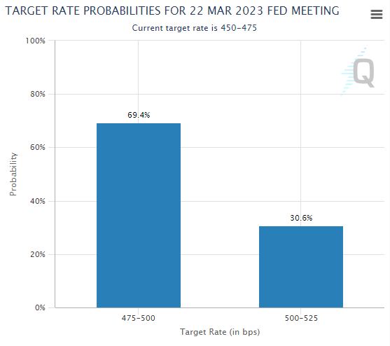 - Markets are pricing in a 30% probability of a 50 bps Fed hike in March.