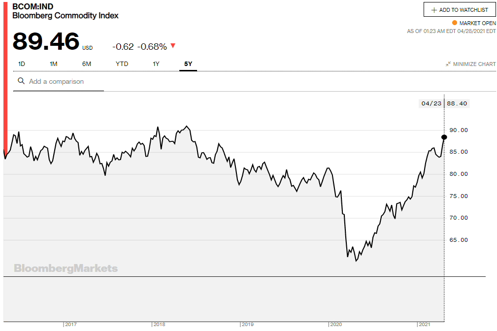 A long rise in the Bloomberg Commodity Index (BCOM) from the pandemic bottom last April topped out in late February at 87.58. Commodity prices then weakened to the second week of this month with the index slipping to 83.58 on the 12th. Prices have since reversed sharply. The index closed at 89.48 on Tuesday the highest it has been since June 2018.