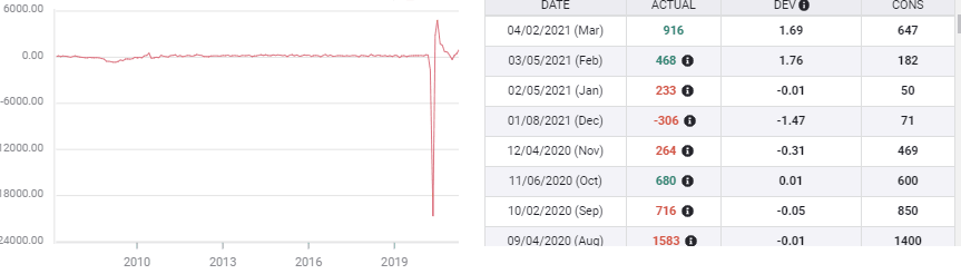 Initial Jobless Claims have fallen more than 200,000 in the last two weeks from 769,000 on April 2 to 547,000 on the 16th. The four-week moving average is down from a high of 856,500 in the week of January 29 to 651,000 last reported.