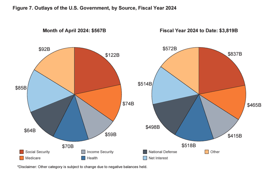 The U.S. government spent $102.4 billion on interest expenses alone in April. This was more than the amount spent on national defense ($64 billion) and more than Medicare ($74 billion). The only spending category higher than interest expense was Social Security.