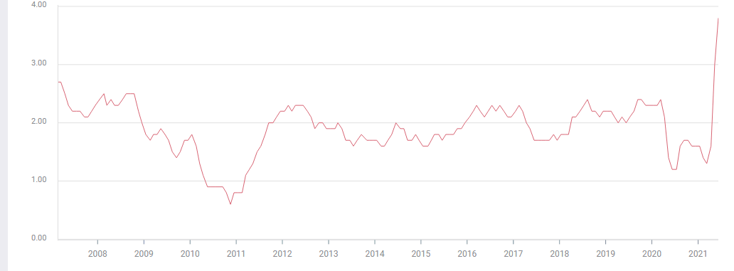 Highest since August 2008 – at 5% YoY headline US Consumer Prices Index has not only beaten expectations but also causes jitters in markets. Core CPI, which excluded volatile food and energy figures, rose by 3.8% yearly, also above estimates and substantially beyond the Federal Reserve's 2% target.