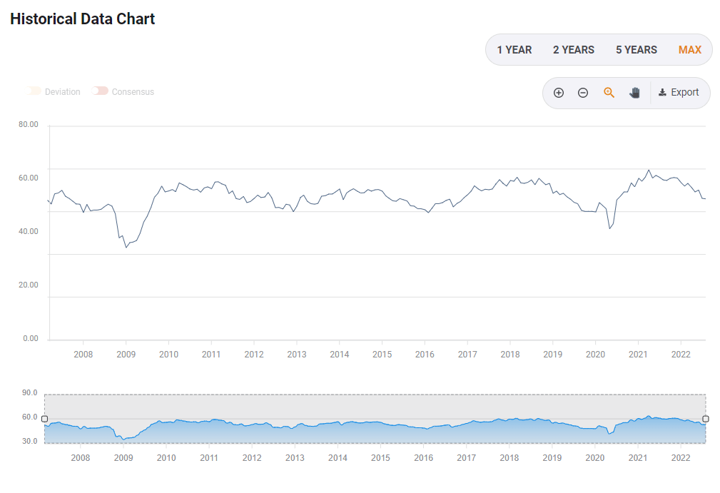 After peaking at a record 64.7 in March 2021, the index reflects slowing economic progress, although expansionary territory (more than 50). The deceleration gained pace in the second quarter of 2022, and the index is dangerously approaching the 50 barrier, which separates growth from contraction.