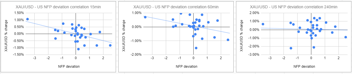 We plotted gold price’s reaction to the NFP release at 15 minutes, one hour and four hours intervals after the release. Then, we compared the gold price reaction to the deviation between the actual NFP release result and the expected result.