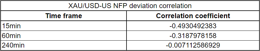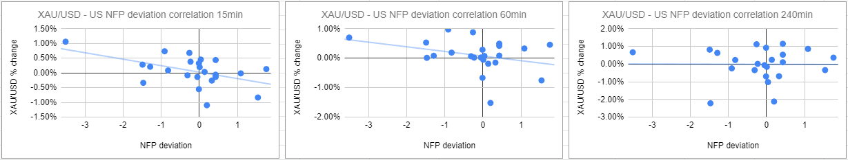 We plotted gold price’s reaction to the NFP release at 15 minutes, one hour and four hours intervals after the release. Then we compared the gold price reaction to the deviation between the actual NFP release result and the expected result.