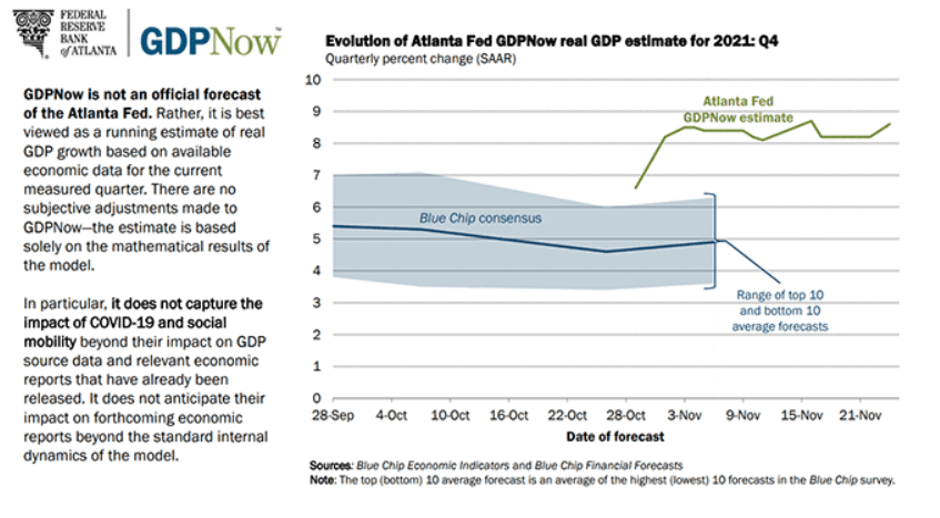 The reason is straightforward. Sales have been strong, new business has been the best in a decade. For many firms labor and supply shortages have inhibited production below the level of orders and permitted large scale price increases for the first time in a generation. Firms can look forward to several quarters of rising profits. Economic growth in the fourth quarter is estimated by the Atlanta Fed to be running at 8.6% annualized.