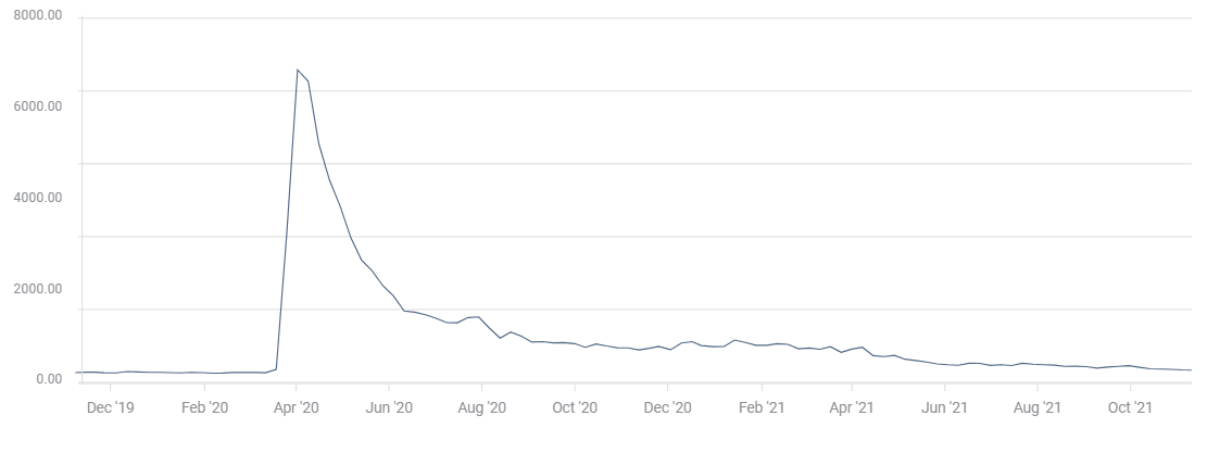Initial Jobless Claims have been under 300,000 for five weeks. At 267,000 in the beginning of November they are approaching the levels of late 2019 before the pandemic lockdowns crushed employment.