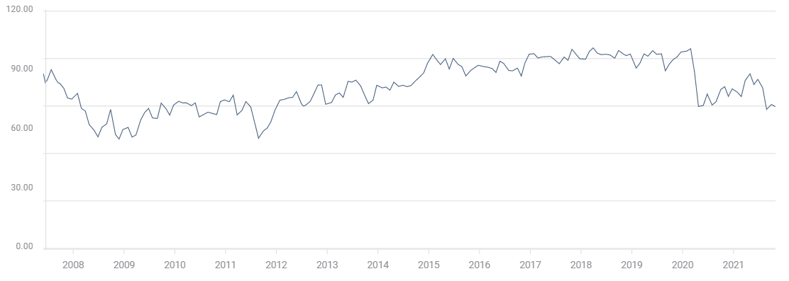 The Michigan Consumer Sentiment Index is forecast to rise slightly to 72.4 in November from 71.7 in October. Since plunging to 70.3 in August, below last April’s pandemic low of 71.8, the Michigan Index has averaged 71.6, its weakest reading in a decade.