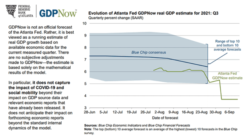 Estimates for third quarter economic growth in the US have dropped sharply in the last month. After averaging more than 6% for most of the summer, the Atlanta Fed GDPNow forecast has fallen to 3.7% in the last two weeks.