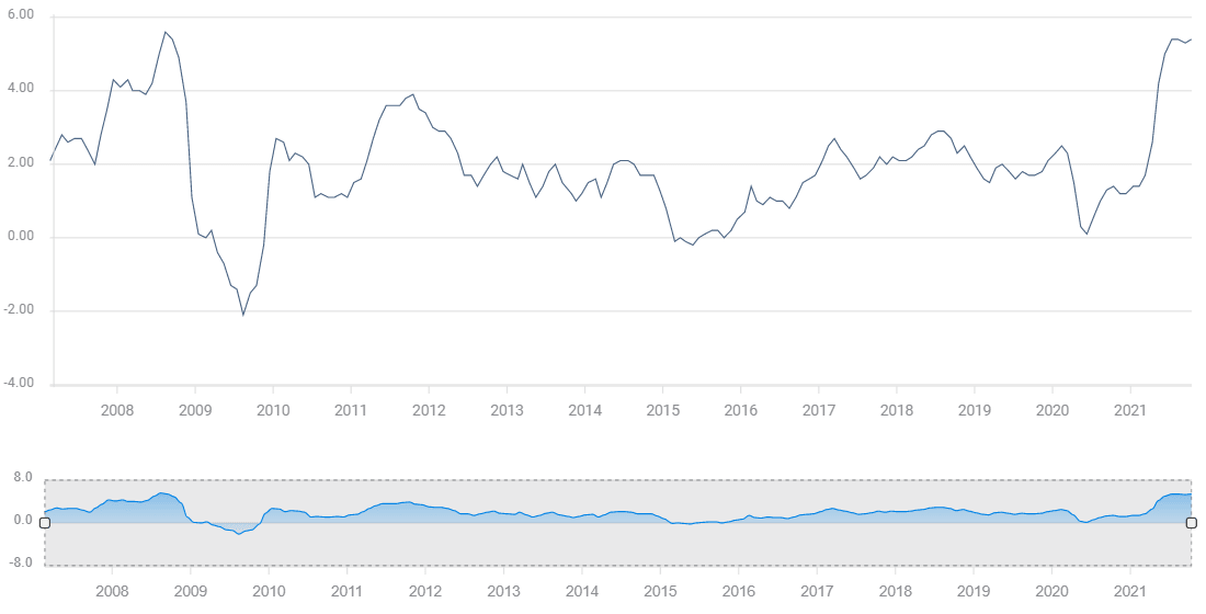Average Hourly Earnings gained 4.6% on the year in September. Annual consumer inflation was 5.4% in September, the highest since July 2008, and the second largest annual gain in three decades.