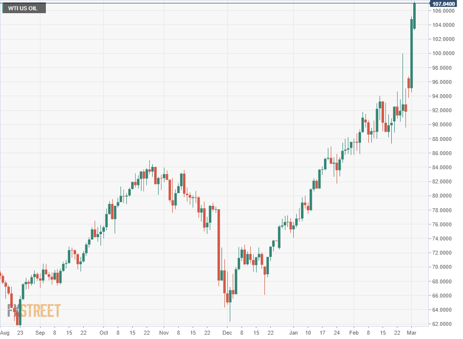 Consumer inflation in the US reached 7.5% in January, a four-decade high, with WTI prices averaging $82.47 for the month. Tuesday’s close of $104.81, represents a potential 27% jump in the world's most basic industrial commodity.