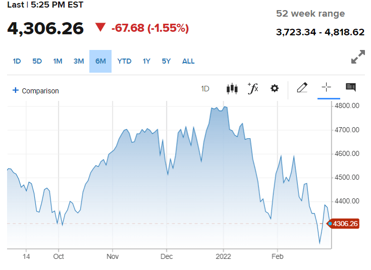 Since the first week of February when the Ukrainian situation began to gather full attention, the S&P 500 has lost about 6% (4,589.38, 2/2/22). The 67.68 point loss on Tuesday brought the index into correction, just over 10% down from its January 3 record of 4,796.56.
