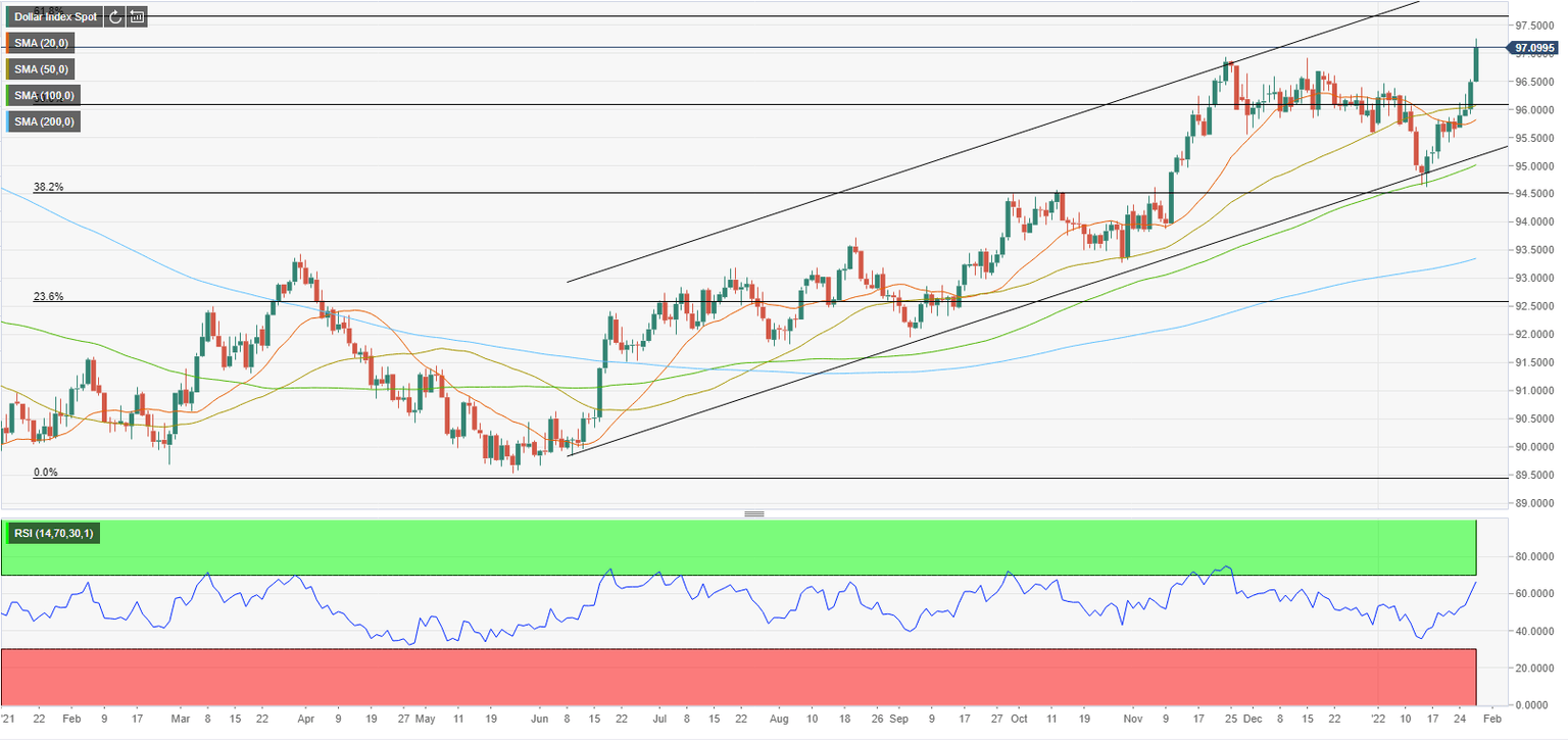 On the upside, 97.70 (Fibonacci 61.8% retracement) could be seen as the first target before 98.00 (psychological level, the upper limit of the ascending trend channel coming from June 2021).