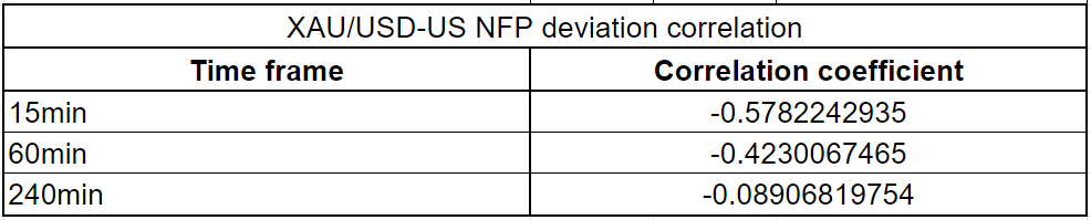 Finally, we calculated the correlation coefficient (r) to figure out at which time frame gold had the strongest correlation with an NFP surprise. When r approaches -1, it suggests there is a significant negative correlation, while a significant positive correlation is identified when r moves toward 1. Since gold is defined as XAU/USD, an upbeat NFP reading should cause it to edge lower and point to a negative correlation.
