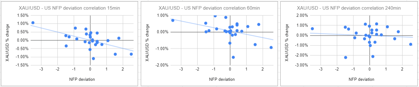 We plotted gold price’s reaction to the NFP release at 15 minutes, one hour and four hours intervals after the release. Then, we compared the gold price reaction to the deviation between the actual NFP release result and the expected result.