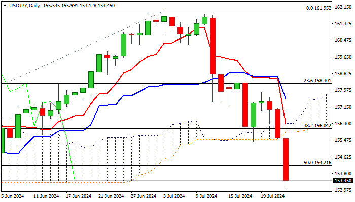 Bear-leg from 157.86 (July 19 lower top) broke through rising and thickening daily cloud (156.30/155.87), 100DMA (155.34) and 50% retracement of 146.48/161.95 (154.21), in extension of the pullback from new multi-decade high (161.95).