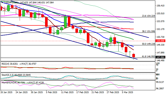 Fresh drop on Monday cracked important supports at 146.95/80 (Fibo 61.8% of 139.57/158.87 rally / lower boundary of larger bear channel.
