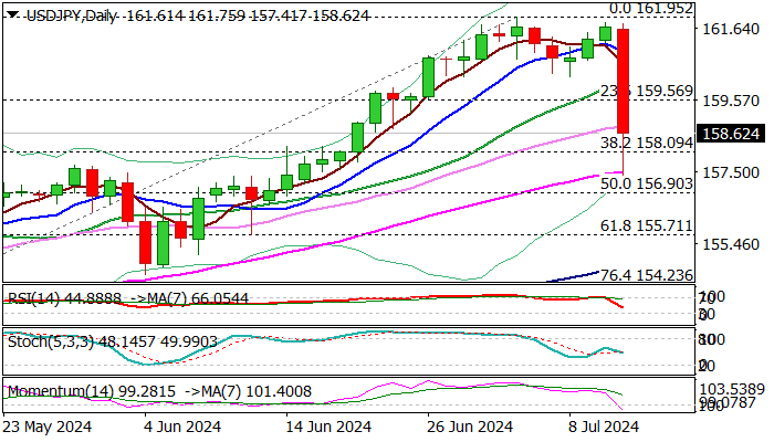 The USDJPY price fell to the lowest in three weeks, in a biggest daily loss since May 1, retracing so fat over 38.2% of 151.85/161.95 upleg, with close below cracked Fibo support (158.09) needed to reinforce fresh and strong bearish signal.