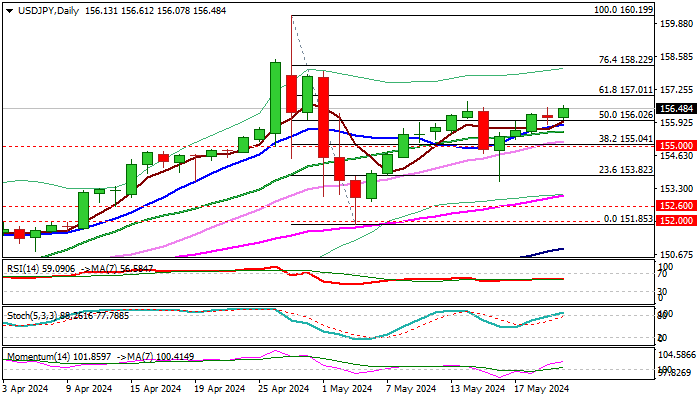 Bulls hold grip and keep initial targets at 156.78 (May 14 high) and 157.01 Fibo 61.8% of 160.19/151.85 correction.