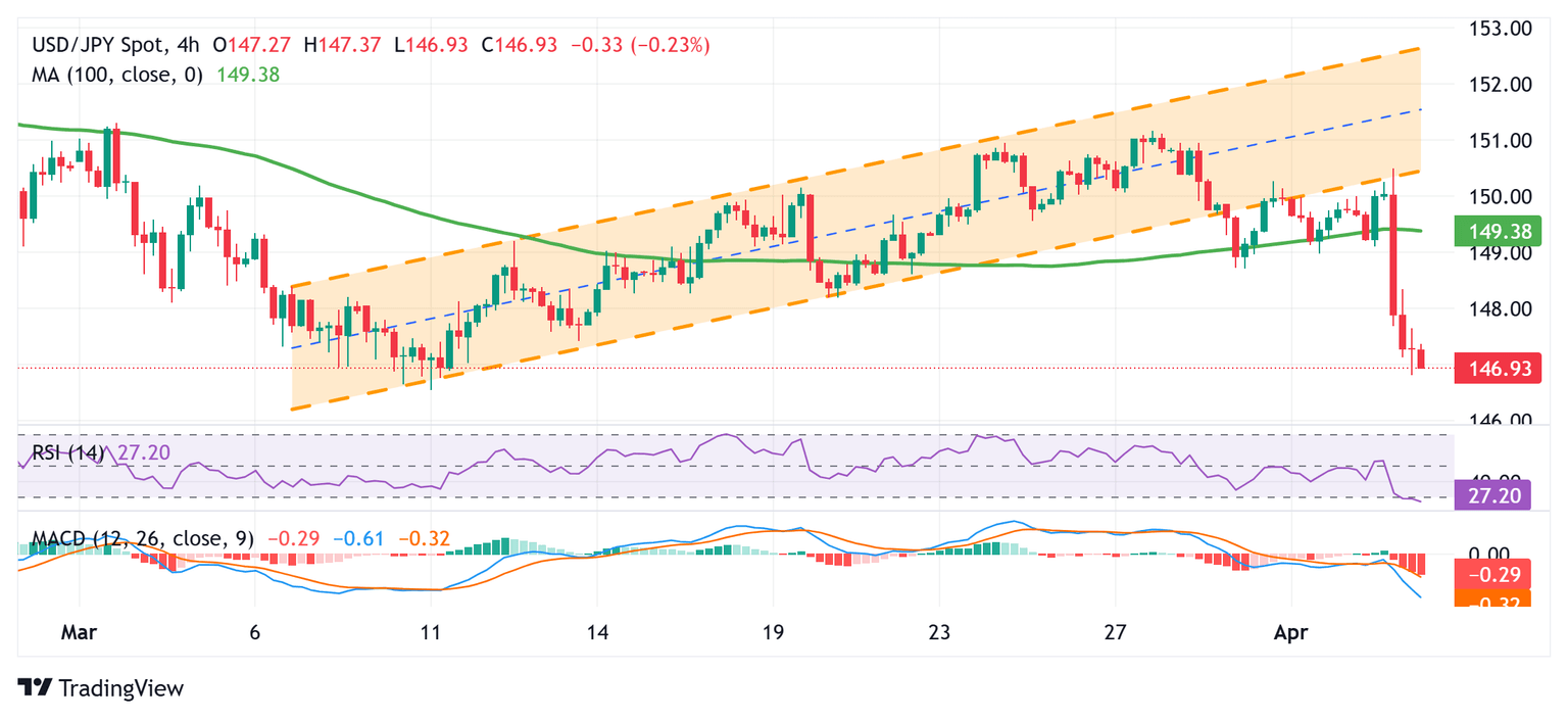 From a technical perspective, the intraday slump below the 100-period Simple Moving Average (SMA) on the 4-hour chart comes on top of the recent breakdown through a multi-week-old ascending channel and favors bearish traders. This, along with the fact that oscillators on the daily chart are holding deep in negative territory and are still away from being in the oversold zone, supports prospects for a further near-term depreciation for the USD/JPY pair. Acceptance below the 147.00 mark will reaffirm the negative bias and expose a multi-month low, around the 146.55-146.50 region touched in March, below which spot prices could accelerate the fall towards the 146.00 round figure.