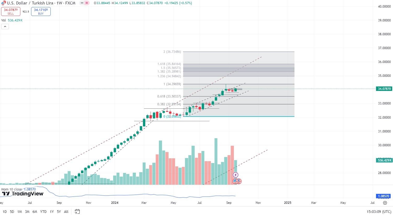 On the daily chart, while the overall long-term picture remains intact, a short-term uptrend began in June. Signs of fatigue became evident after the August peak, as the pair faces resistance in breaking decisively through the 34 level. Given the current trading range, key levels to monitor include support around 33.79 and resistance in the 34–34.10 area, with the August 28 peak at 34.39 as the next critical level (Image 3).